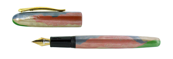 We made Hanryo for customers who prefer smaller pens. The pen's total length, with cap closed, is 5‑13/16” (140mm); the barrel's diameter is 11/16” (15mm) and is made of ebonite. It uses a standard cartridge‑convertor system. These pens use simple, traditional designs as well as some with Haiku and Waka. If you have any questions about the designs, Haiku or Waka, please let us know.