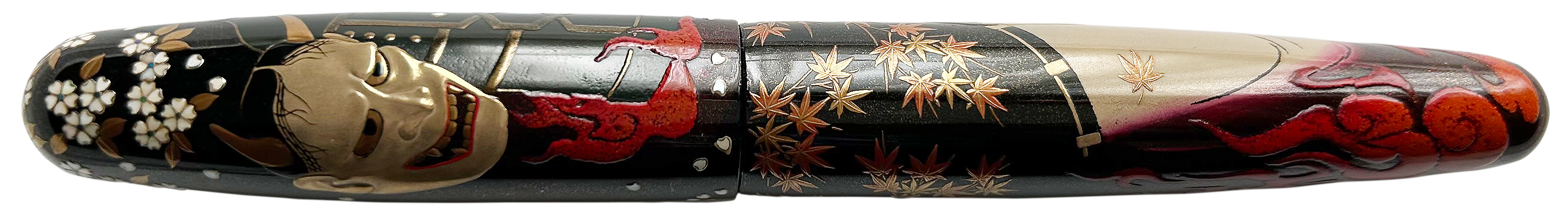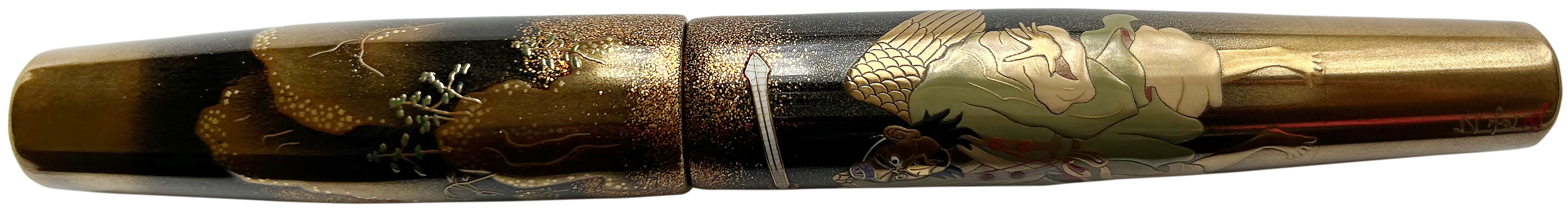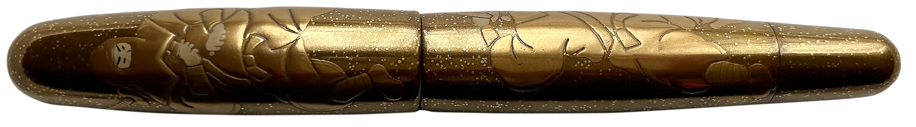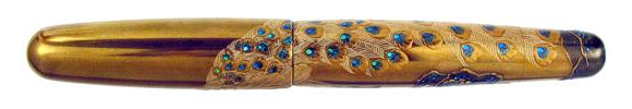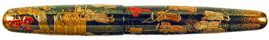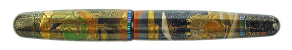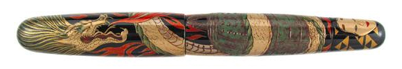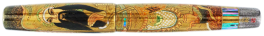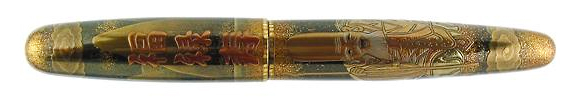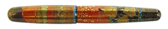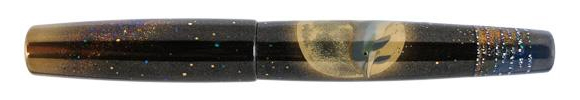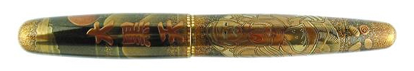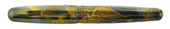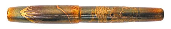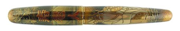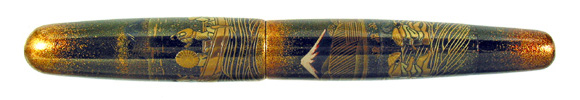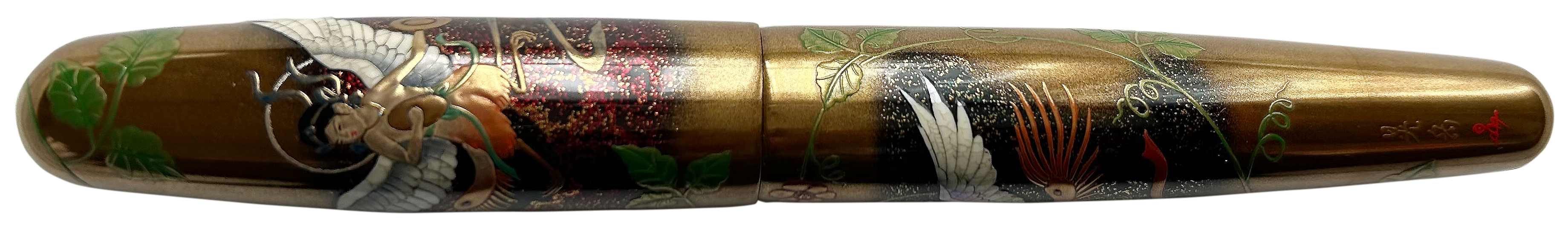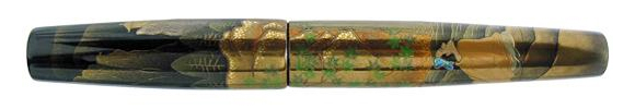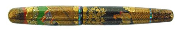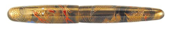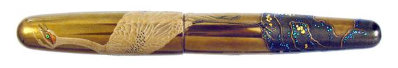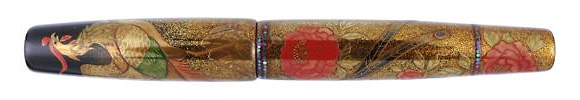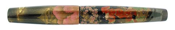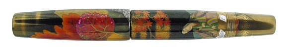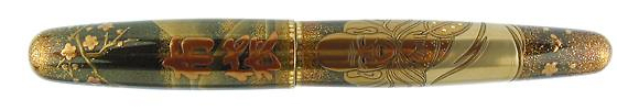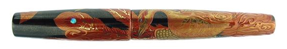 When we only had medium‑size Maki‑e pens, we felt we needed larger pens for more complex Maki-e art; we made Mikado for that purpose, several years ago. This pen uses the Eyedropper system. It is 6‑3/8” long when the cap is closed, and the diameter of the barrel is 13/16” and heavy. The Maki‑e on this pen is very good because of its larger surface area. The nib is size #8, in 18k gold, and available with F, M, B and Stub.