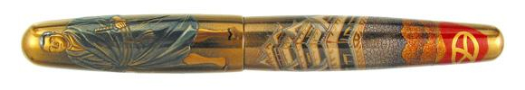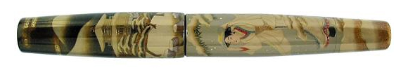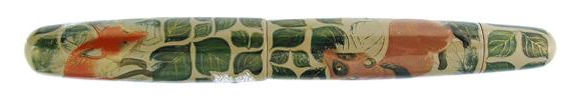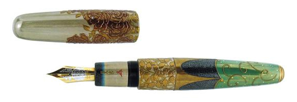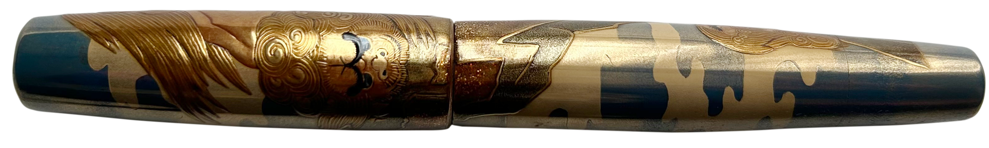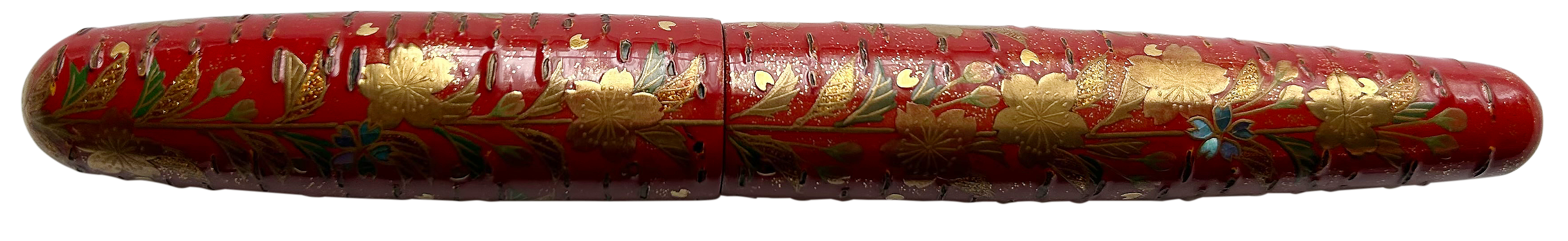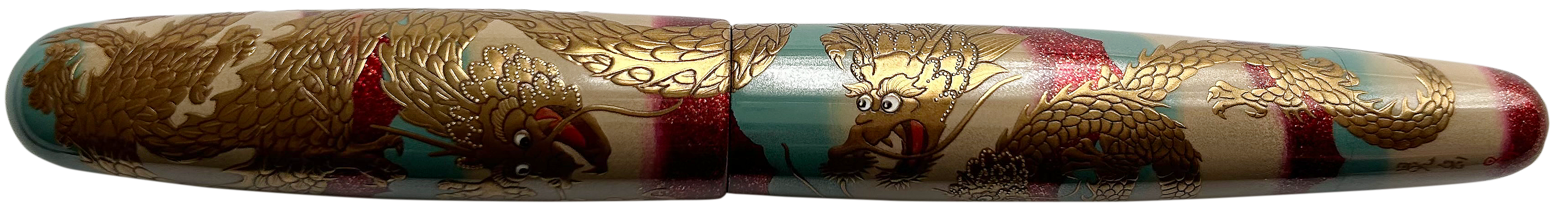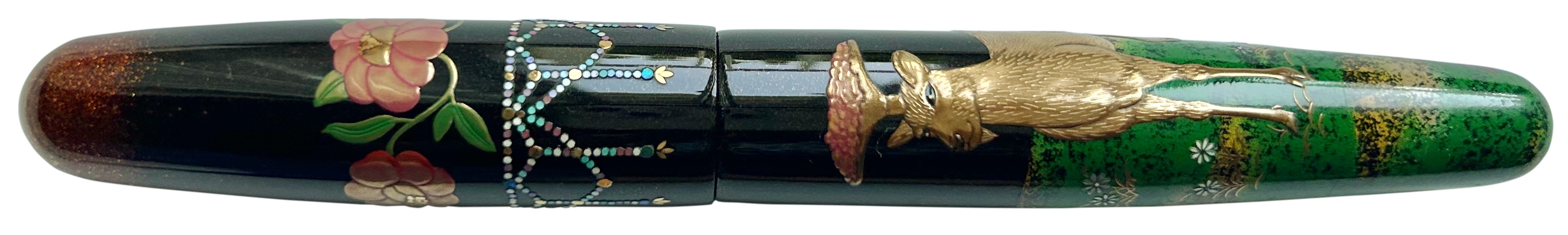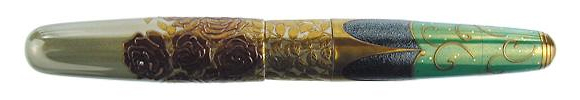 When we only had medium‑size Maki‑e pens, we felt we needed larger pens for more complex Maki-e art; we made Mikado for that purpose, several years ago. This pen uses the Eyedropper system. It is 6‑3/8” long when the cap is closed, and the diameter of the barrel is 13/16” and heavy. The Maki‑e on this pen is very good because of its larger surface area. The nib is size #8, in 18k gold, and available with F, M, B and Stub.