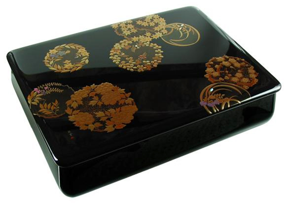 Platinum powder is used on the tails and the crest of the wave. On the cap, he uses Taka Maki‑e, and Kirigane (rectangular gold foil) and Marugane (round shape gold foil) for the cloud. It is a masterpiece.